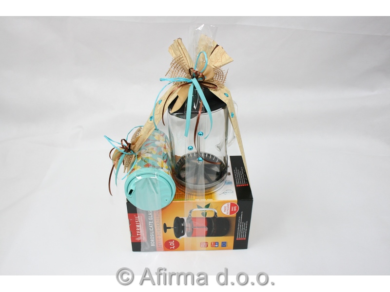Steklen vrč za kavo 1 l s filtrom in lonček iz umetne mase v darilnem pakiranju.