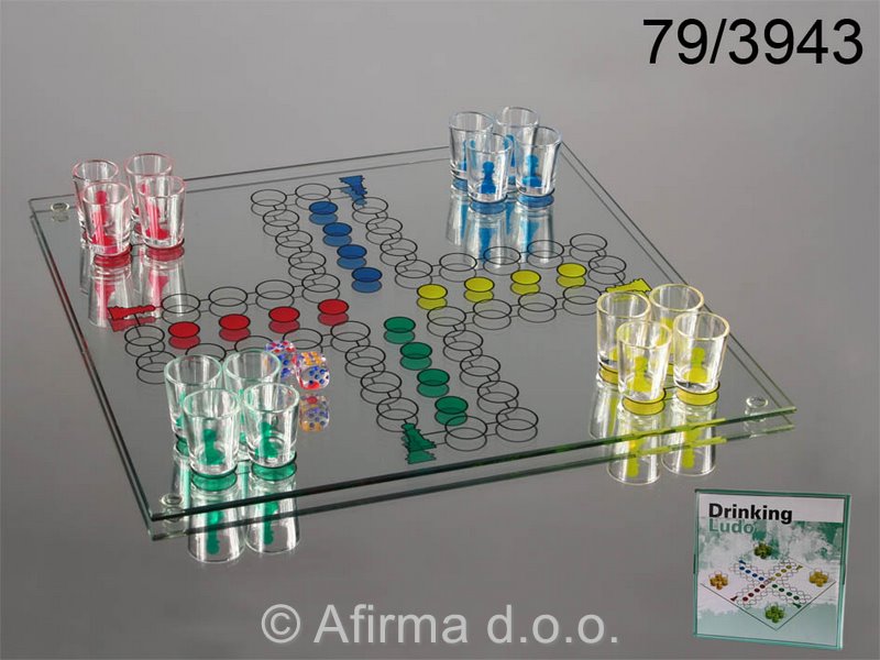 Igra človek ne jezi se s kozarčki za žganje na stekleni podlagi.