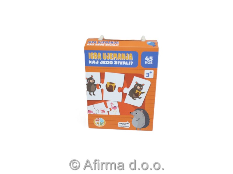 Sestavljanka na temo prehranjevanja živali. Igro sestavlja 45 kosov sestavljanke, iz katerih otroci sestavijo 15 ujemjočih parov. Igra spodbuja koncentracijo in pomaga razvijati prostorsko zaznavanje, bogatenje besednaga zaklada in urjenje fine motorike. Primerno za otroke od treh let dalje.