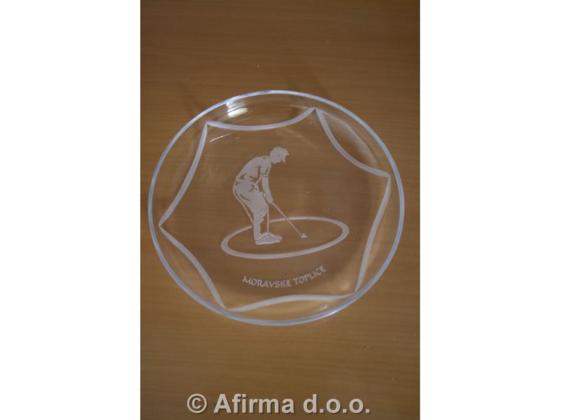 Brušen stekleni krožnik 19 cm, pakiran v darilni embaži. Različni motivi (golf, lovci, ribiči, gasilci). Možna izdelava motiva po naročilu oz. predlogi.