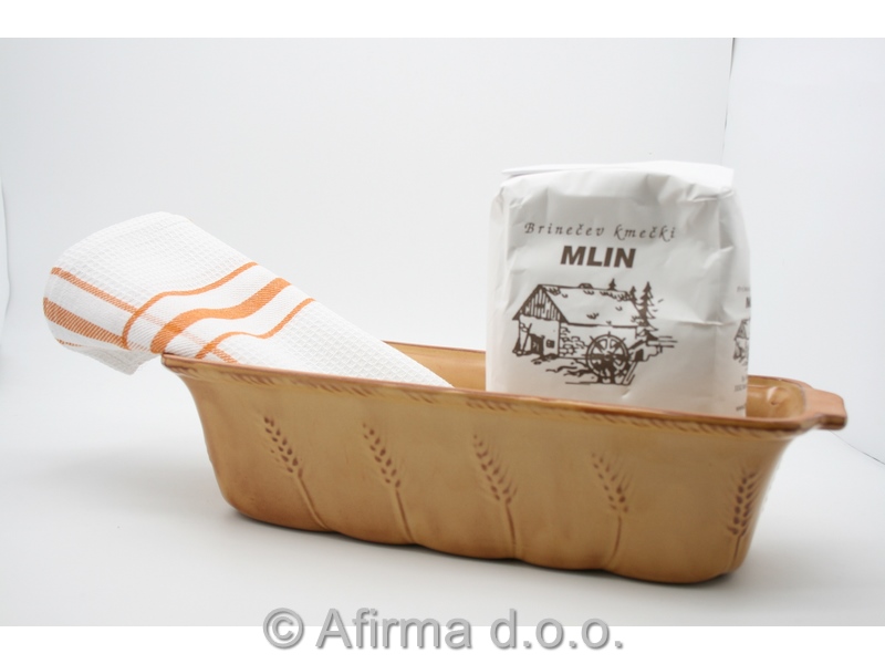 Darilni set je sestavljen iz keramičnega pekača dolžine 32 cm, bombažne vafel krpe 45x70 cm ter 1 kg moke za pecivo iz Brinečevega kmečkega mlina. Keramičen pekač je primeren za pripravo, peko, serviranje in stranjevanje živil. Zdrži temperaturo od -40 do 240 st.C.