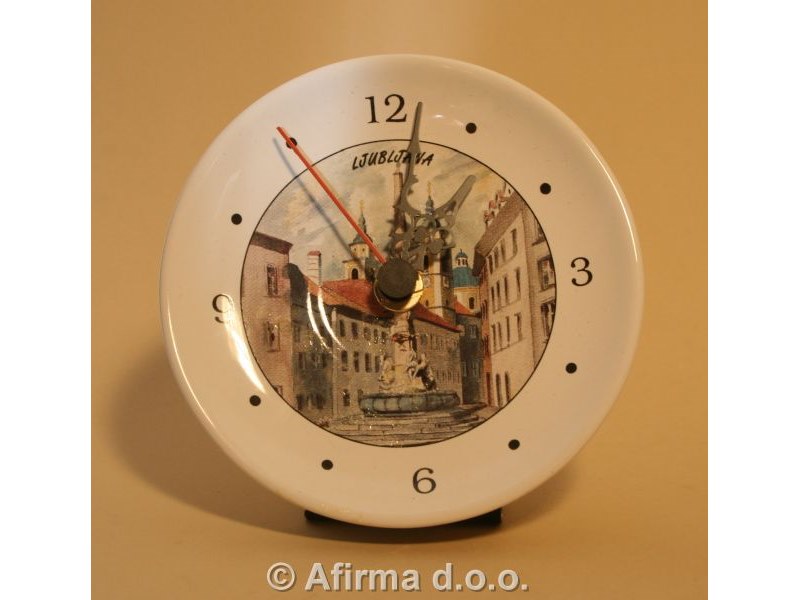 Keramična namizna ura, premer 12 cm. Motivi: turizem - večja mesta in turistični kraji, (Slovenija, Hrvaška), Kofetarica. Pakirano v darilno embalažo.