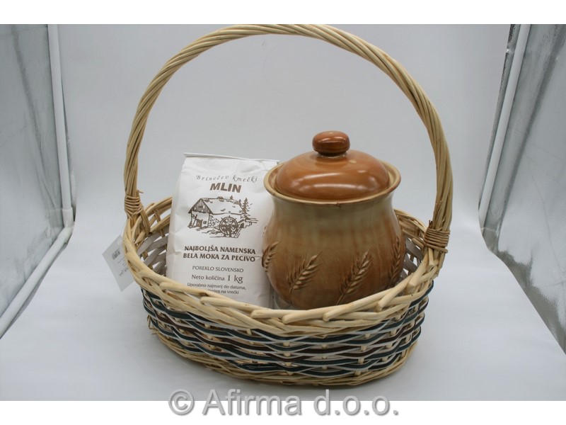 V pleteni košarici dolžine 26 cm z ročajem čakata na domače mojstre peke keramična posoda za živila višine 12 cm (višina brez pokrova) z reliefnim motivom klasja in en kilogram moke za pecivo iz Brinečevega mlina.