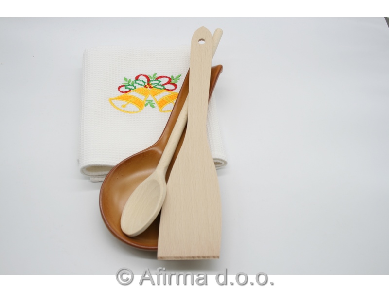Darilni set 21 sestavljajo keramični podstavek za kuhalnice dolžine 26 cm, bombažna kpa vafel 45x70 cm (sezonski motivi) in leseni pribor (špatula in kuhalnica 30 cm).