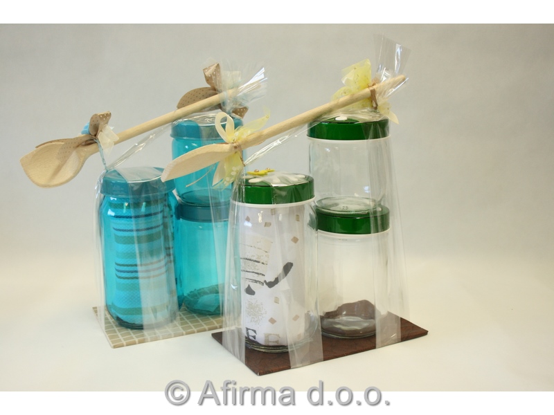 Tri steklene doze (0,425; 0,66 in 1l), bombažna kuhinjska krpa in lesena kuhalnica v sezonskem darilnem pakiranju.
