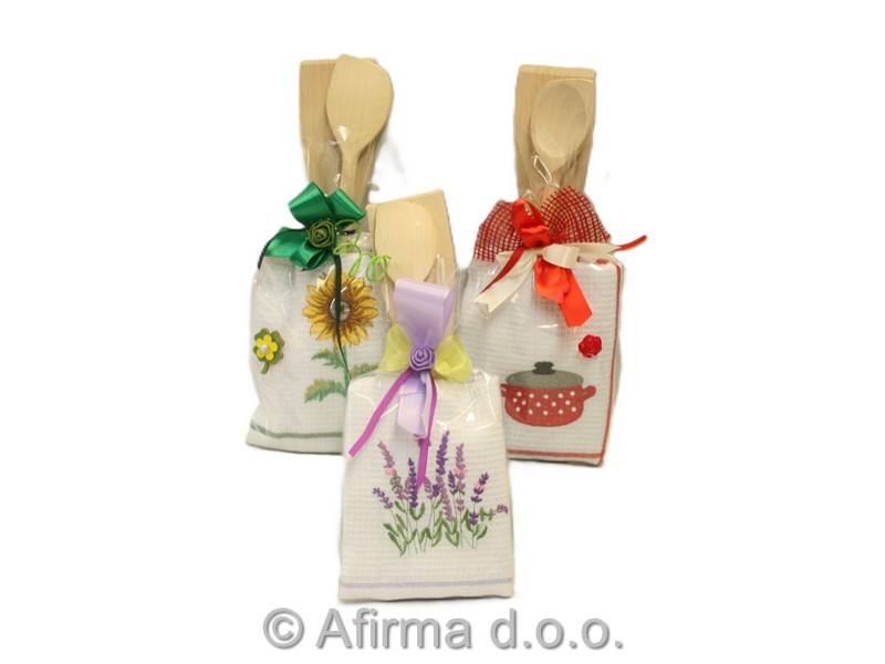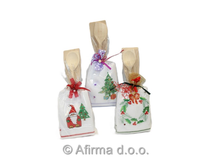 Darilni set sestavljajo bombažna vafel krpa 50x70 cm s sezonskim motivom ter lesena kuhalnica s konico in špatula.