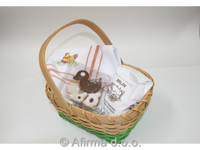 Darilni set sestavljajo : pletena košara z preklopnim ročajem 31x26x14 cm, bombažna vafel krpa 45x70 cm s sezonskim motivom, moka in domači keksi iz Brinečevga kmečkega mlina.