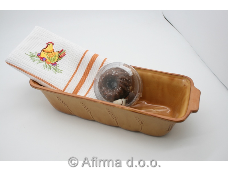 Darilni set je sestavljen iz keramičnega pekača za kruh dolžine 32 cm, bombažne vafel krpe 45x70 cm ter 100 g domačih keksov iz Brinečevega kmečkega mlina. Keramičen pekač je primeren za pripravo, peko, serviranje in stranjevanje živil. Zdrži temperaturo od -40 do 240 st.C.