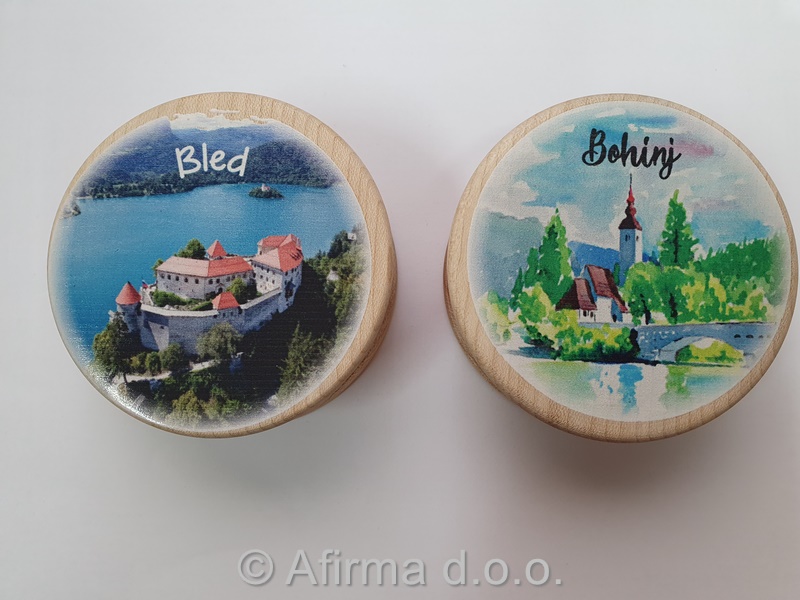 Lesena šatuljica fi 8 cm s potiskanim pokrovom.