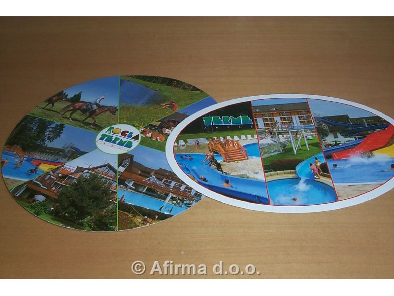 Okrogla ali ovalna razglednica. Motivi: turistični kraji, po naročilu.