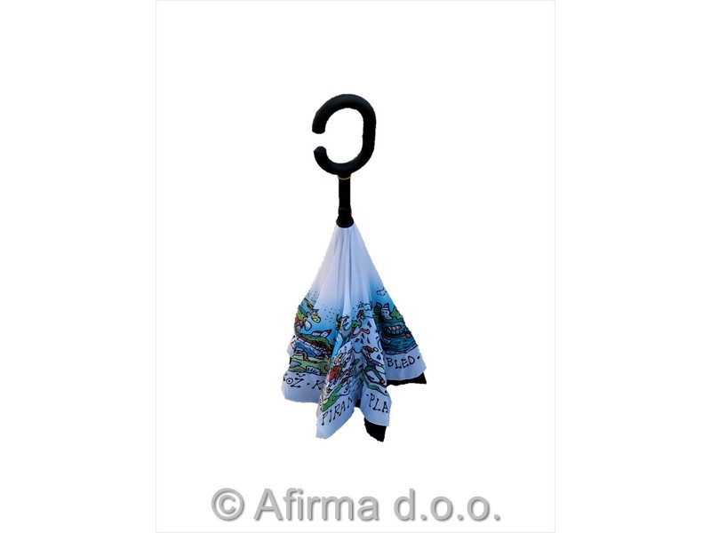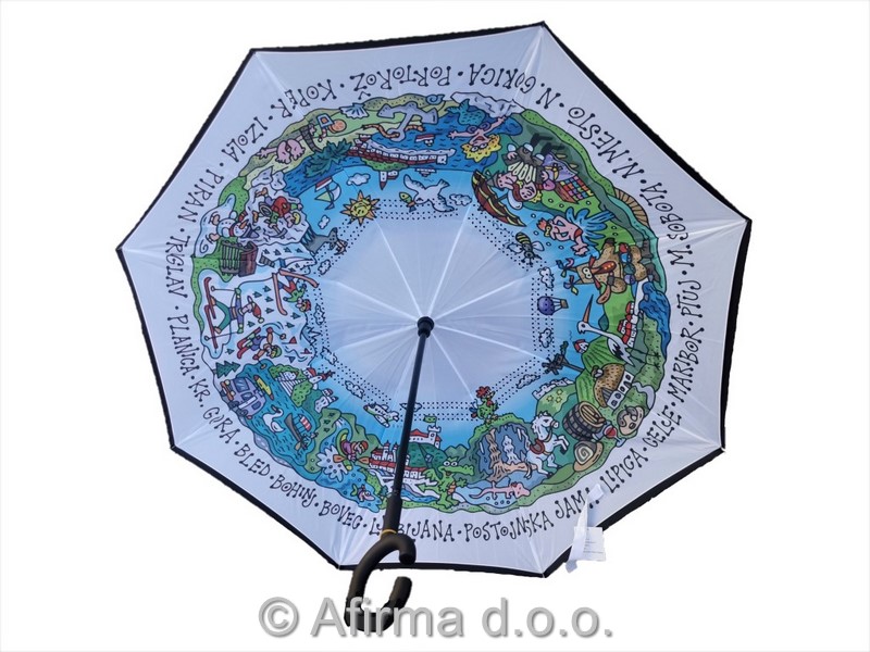 Dvoslojen dežnik premera 110 cm je na notranji strani potiskan z motivi ilustracij izbranih slovenskih turističnih destinacij. Motivi na dežniku so delo znanega slovenskega karikaturista Marka Kočevarja. Dolžina ročaja: 82 cm. Odpiranje in zapiranje: ročno. Zunaja barva dežnika: črna.V zaprtem položaju dežnik stoji samostojno in ne potrebuje dodatne opore.