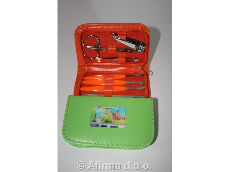7 delni manikirni set z motivom. Pakiran v oranžnem, zelenem ali črnem etuiju.
