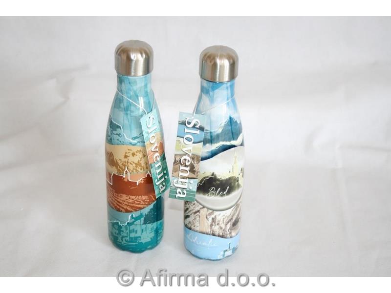 Kovinska steklenica je primerna za hranjenje in prenašanje hladnih ali toplih pijač. Steklenica je na razpolago v dveh variantah z motivoma na temo Slovenije.