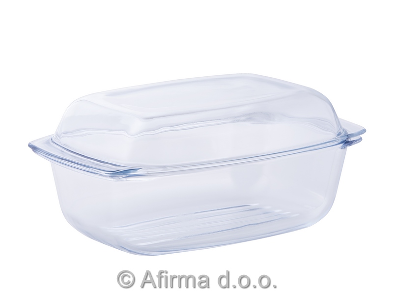 Steklen pekač s patentiranim pokrovom omogoča zdravo in hitrejšo pripravo jedi. Rebrasto dno pa omogoča enakomernejše kroženje zraka v pekaču. Pekač je primeren za uporabo na eletrični in steklokeramični plošči, v elektični in mikrovalovni pečici. zdrži temperaturo med -50 in +500 st.C.
