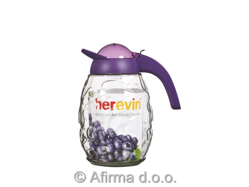 Steklen vrč s pokrovom in ročajem iz umetne mase. Barva ročaja: vijolična ali rdeča.